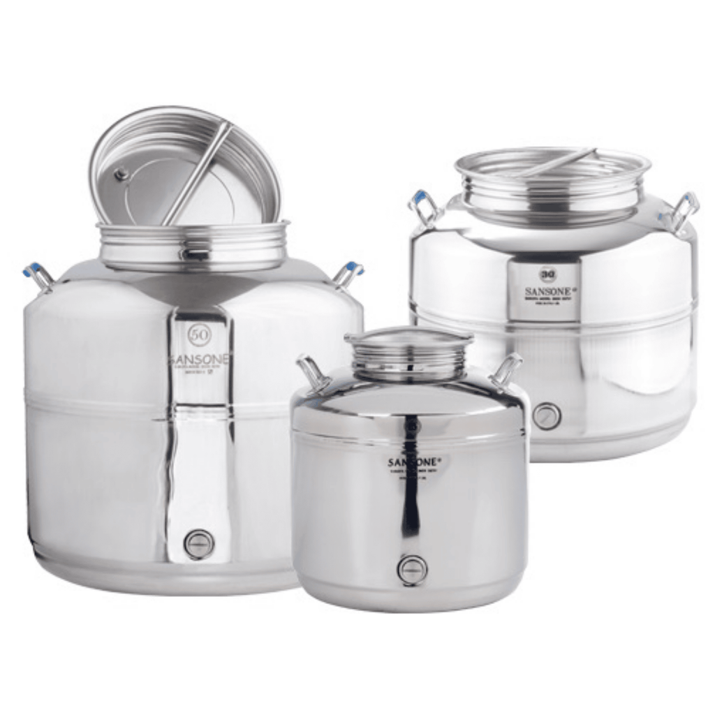 Il fusto Sansone è costruito con tecnologia di saldatura di alta precisione: la parte superiore è realizzata in un unico pezzo, senza giunzioni, per ridurre al minimo i rischi di perdita. Le maniglie laterali in acciaio inox, saldate mediante piastra, permettono un trasporto sicuro e agevole anche a pieno carico.